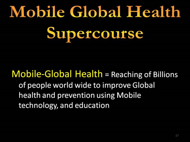 The concept of Mobile-global health is simple. For the first time we can reach billions of people world wide using cell phone, for pennies. There are 5.2 billion cell phones for 6.2 billion people. |