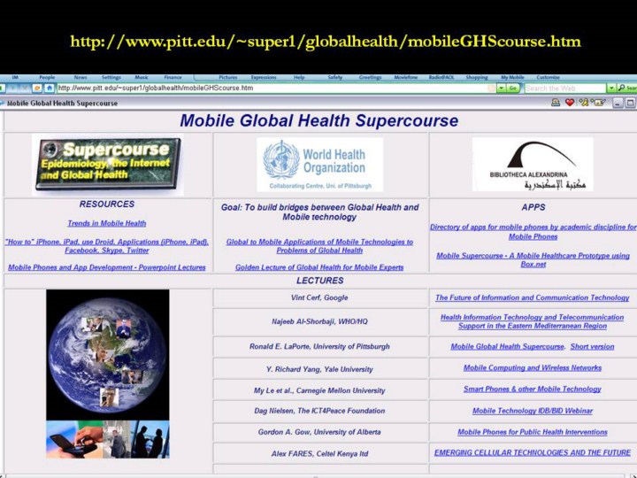 We build a Mobile Global Health web page with lectures. If one searches on Mobile Global Health lectures over 130,000,000 sites are found and we are number one and two. In this site we have compiled resources. We have lectures about mobile health. http://www.pitt.edu/~super1/globalhealth/mobileGHScourse.htm |