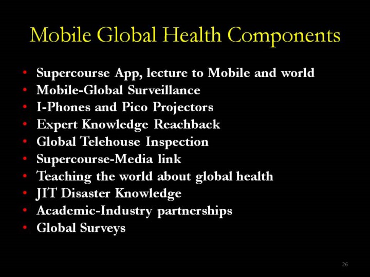 Here are some of the ways by which a Mobile Global Health Supercourse could develop. We are pushing the Supercourse lectures into mobiles with a Supercourse app. We have published several papers on Mobile technology and surveillance, not only for infectious diseases, but also chronic diseases. Linking a Supercourse App, with Iphones and pico projectors provides teaching technologies for even the remotes regions. With Mobile technology we can reach into intelligent networks to find help. One of the major concerns in disasters is that of habitability of houses. We are collaborating with the International association of certified house inspectors, to relay Cell pictures to a disaster reading center for houses to make judgments about habitability. In China they presented our infectious disease lectures to millions of people on TV. We have developed a global health lecture that is being distributed to all the medical and public health schools. The Mobile technology is ideal for providing rapid scientific knowledge at the time of a disaster. Both those in academia and business believe that we can improve the health of the world. We now have the opportunity to do global health surveys over mobiles. What else can imagine to use Cells in Local to Global Health? |
