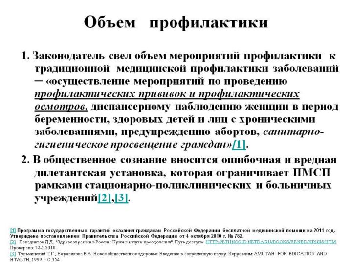 [1] Программа государственных гарантий оказания гражданам Российской Федерации бесплатной медицинской помощи на 2011 год. Утверждена постановлением Правительства Российской Федерации от 4 октября 2010 г. № 782. [2] Венедиктов Д.Д. "Здравоохранение России: Кризис и пути преодоления". Путь доступа: HTTP://ETHNOCID.NETDA.RU/BOOKS/VENED/KRISIS.HTM. Проверено: 12-1.2010. [3] Тульчинский Т.Г., Варавикова Е.А. Новое общественное здоровье: Введение в современную науку. Иерусалим: AMUTAH FOR EDICATION AND HTALTH, 1999. – С.354 |