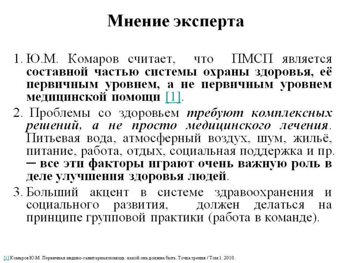[1] Комаров Ю.М. Первичная медико-санитарная помощь: какой она должна быть. Точка зрения / Том 1. 2010.
