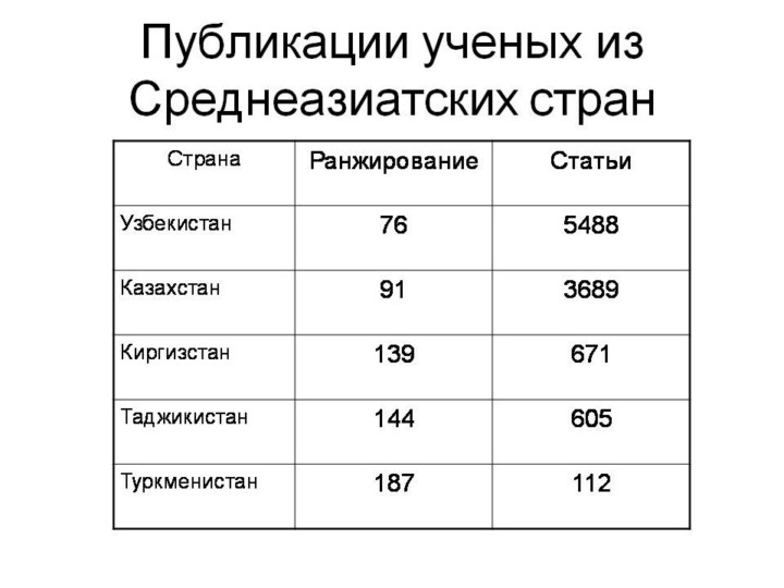 Число публикаций во всех странах Средней Азии низкое. Единственная страна с числом публикаций выше среднего – Узбекистан с 76 местом из 192 стран мира. Показатели остальных 4 стран находятся в нижней половине списка. Обзор данных представлен за 13 лет. В результате Узбекистан имеет в среднем 400 статей в год, а Туркменистан только 9. |