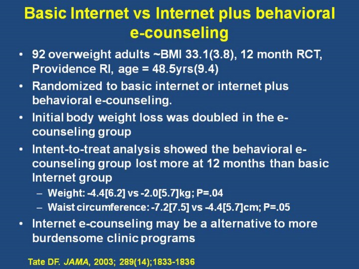 Intervention: each group did receive 1 face to face counseling session and same core internet programs to submit weekly weights E-counseling additionally submitted calorie and exercise information and received weekly e-mail behavioral counseling and feedback from a counselor. |