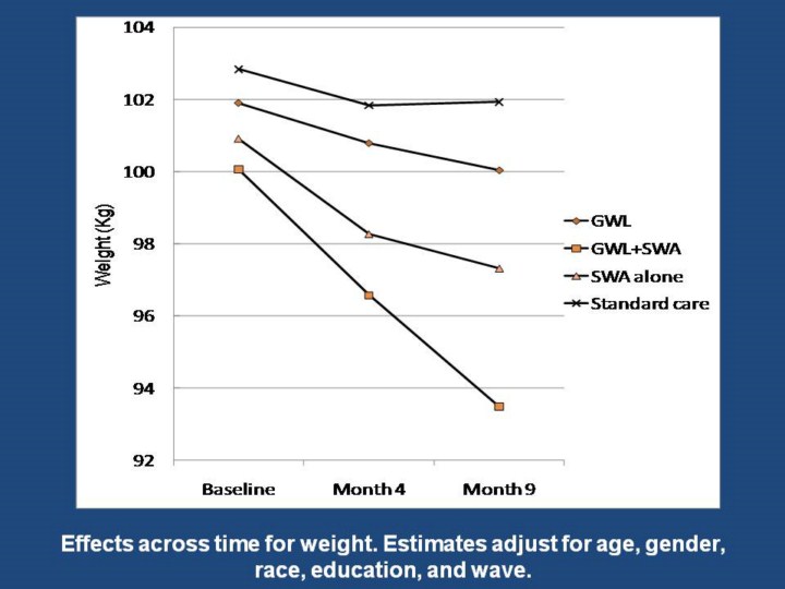 All compared to the GWL At month 4, no significant difference in weight between GWL and GWL+Armband (P=0.23) which means GWL+Armband produced weight loss comparable to the GWL over 4 months. At month 9, there is borderline significant difference in weight between GWL and GWL+Armband (P=0.06) which means GWL+Armband produced weight loss greater than the GWL over 9 months. At month 9, no significant difference in weight between Armband alone and GWL (P=0.44) which means Armband alone produced weight loss comparable to the GWL over 9 months.