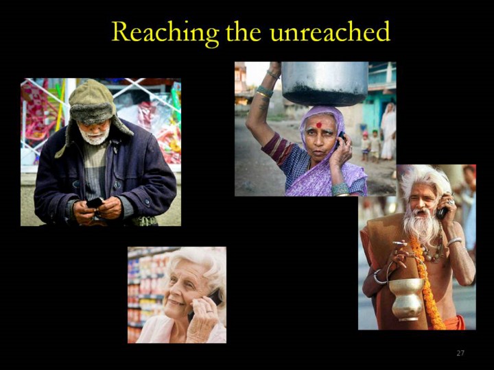 | We have to reach the unreached and we are. About 50% of the homeless in the US has a cell. The cells have reached aborigines in the outback of Australia. Rural women in India have ready access, as do the elderly.