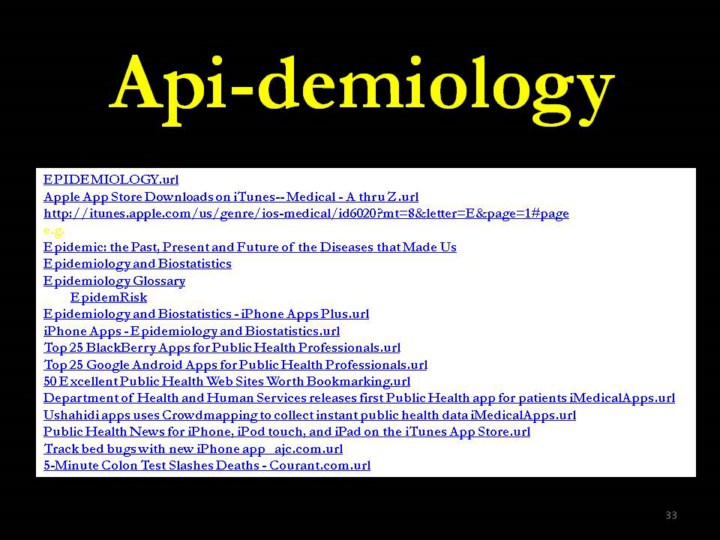 | As part of this we think there should be a new field called Api-demiology. We also have identified all the apps for global and public health. The apps for the most part in our field are primitive with little quality control. However more and more apps are being produced in all fields.