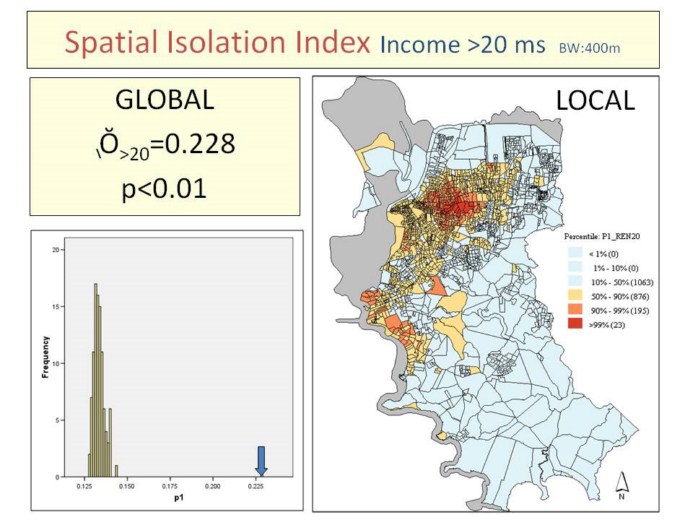 The Spatial isolation Index was calculated for each income group, for each census tract. This slide shows the results for the income group that earns more than 20 minimum salaries per month. The global index was 0.23. This means that where each member of this income group lives, about 23% of the population belongs to the same income group. And this number is statistically significant. Looking to the local indexes in the map, we can observe that the census tracts were these rich people are more isolated are clustered around the central area of the city. Following the same pattern observed in the previous index (the spatial clustering index) |