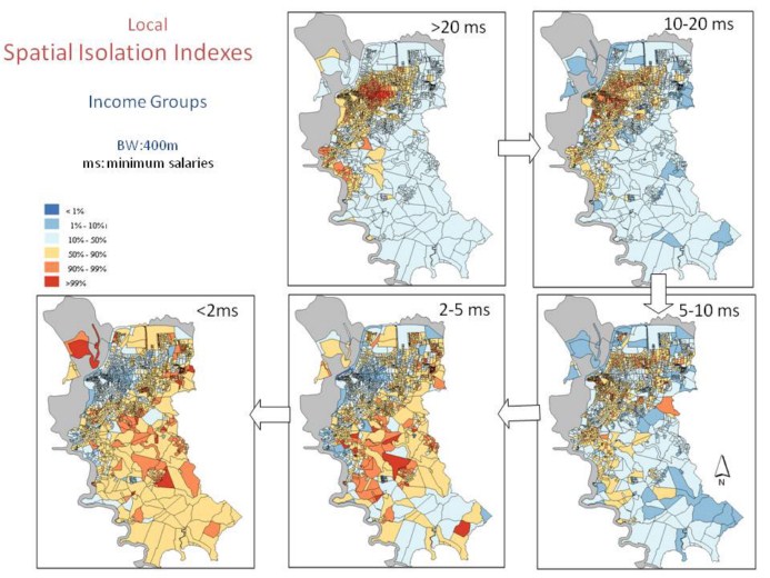 And Here are the maps of local Spatial Isolation Index. The richest people are isolated in the central area of the city. It looks like an onion, several layers, each one representing the area where one income group lives, isolated from the others. The richest in the centre and the poorest in the distant suburbs.