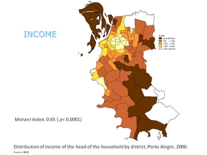 This is the distribution of the mean income of the head of the households, by districts. Again we can observe that there is a spatial pattern. The rich people clustered around the central area of the city. And what the map suggests, the Moran I Index confirms. There is a significant spatial autocorrelation. This means that there is here a high degree of income inequality.