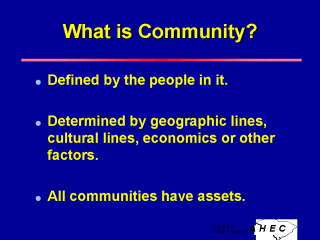 Communities are defined from within, not from without. To assume an external body knows more than those who make up a community is a fatal error in building healthy communities. Communities may form around “place”, “culture”, “economics”, “common circumstances” and/or “common vision of life”. In the “Neck” area of Charleston, SC, a community was defined by the need to address industrial pollution that was invading the homes in a seven mile section of the northern approach to the city. Members of this community lived with unpleasant fumes from factories processing chemicals, and lived in constant fear of the alarm signaling an accident that might pose a risk to the public’s health. Another example of community in Charleston is the Jewish community. Members come from all areas of the city and county, and they are joined by the common belief, culture and values of an age-old religion. Yet another Charleston community is that of the gays and lesbians, who define their community by their sexual preferences and behaviors. These are all valid communities, each with assets, resources, and needs. |
