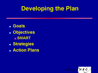 Where do we want to be? The answer to this question forms the basis for developing goals and objectives for the group. Goals are broad statements related to achieving the vision of a group. Objectives are more internally focused statements of the means for accomplishing a stated goal. They are expressed in terms of the results a group wishes to achieve in the medium to long term. Objectives should reflect the underlying reasons for the group’s purpose and relate to the expectations and requirements of all the major stakeholders. Both goals and objectives should be SMART: Specific, Measurable, Achievable, and Timely. How do we get there? Strategies and Action Plans provide the details for achieving objectives. Strategies are the means to an end, and should define the expected outcomes. Action plans specify the actions required to implement strategies and identify the appropriate timing and accountable person. |