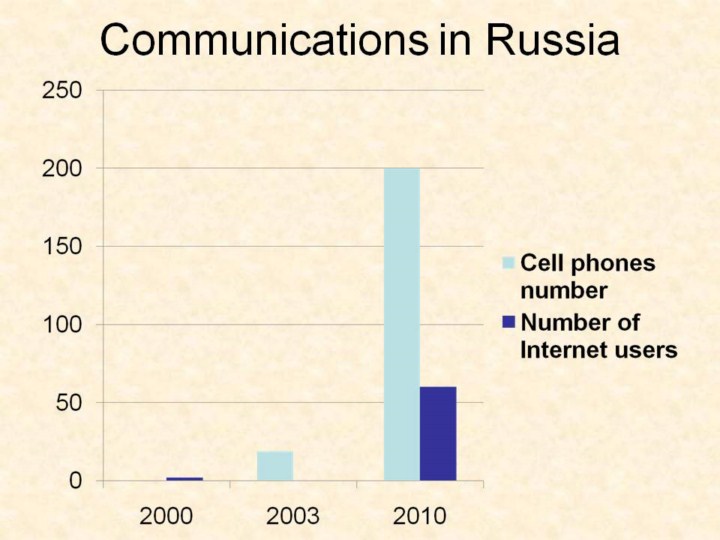 During last 10 years we have a rapid growth in the number of internet users and number of cell phones in Russia and FSU countries. We started development of FSU Supercourse at the beginning of year 2000. At that time, the number of Internet users in Russia reached 2 million. The World FactBook http://www.odci.gov/cia/publications/factbook/geos/rs.html#Comm (Supercourse lecture 5071) There are about 1,33 cell phones for every one person living in Russia.