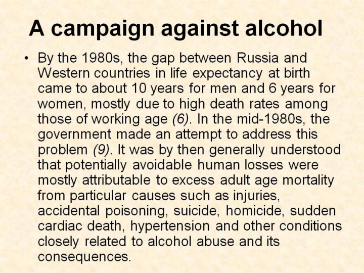 A campaign against alcohol was launched, in which alcohol prices were raised and sales outlets cut, enforced by punitive measures (11). Although this large scale anti-alcohol campaign was primarily introduced to tackle the loss in productivity from widespread alcohol use, it also had an impact on health. State production and sales of alcoholic beverages (the only legal source of alcohol in the USSR) dropped to less than one third, the prices of alcoholic beverages were raised, further measures were taken against the production of strong homemade alcoholic beverages, and legal sanctions were enforced. Further, the network of medical establishments for compulsory treatment of alcoholism was expanded. |