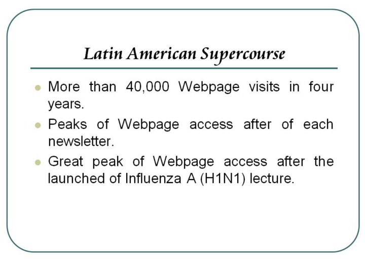 We sent each month, a newsletter at all contacts of Latin American Supercourse and in four years of the Latin American Supercourse, we received more than forty thousand visits and we noted a slight peak of webpage access after the each monthly newsletter but a great peak after the Just In Time lectures as Influenza A(H1N1). |