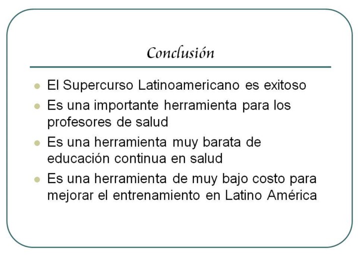 El Supercurso Latino Americano es una herramienta útil para los profesores y estudiantes en salud en países latinoamericanos y para educación continua proveniente de líderes en salud en el mundo. Necesitamos promover el uso del Supercurso Latino Americano y lo podemos hacer mejor si ustedes nos regalan sus mejores presentaciones para traducirlas y colocarlas en el Supercurso. America countries and for continuous education from leaders in health worldwide and students, too. We need to promote more the Latin American Supercourse |