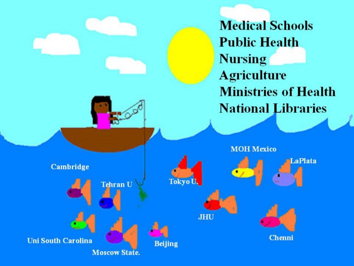 We have fished the web and complied lists of all the Medical, public health nursing, agriculture schools, MOH, and National Libraries. The Deans and heads serve as gateways to their faculties and students. They have forward much of the Supercourse and WHO materials, reaching millions with global health. |