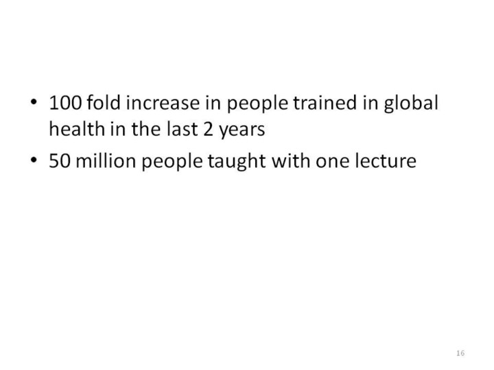 We have been very successful, as we have produced over 100 fold increase in global health in only 2 years. Our H1N1 lecture was seen by 50 million people. |