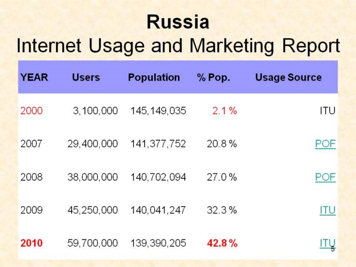 We started from putting preventive lectures and materials into Internet Improving Internet Usage is big advantage for Internet based programs. At the beginning of year 2000 the number of Internet users in Russia reached 2 with 3 millions at the end of the year. The World FactBook http://www.odci.gov/cia/publications/factbook/geos/rs.html#Comm (Supercourse lecture 5071) http://www.internetworldstats.com/euro/ru.htm