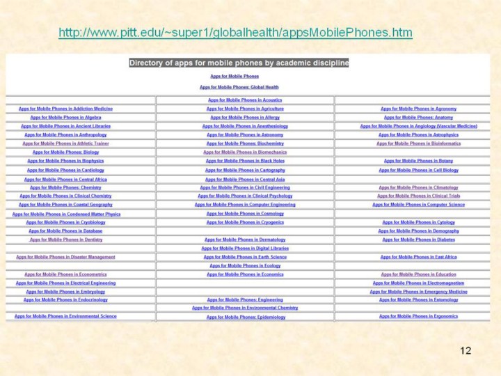 Directory of apps for mobile phones by academic discipline also number 1 site if you search by Google - http://www.pitt.edu/~super1/globalhealth/appsMobilePhones.htm |