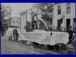 | The link between health and the environment was clearly understood in this old photo. The public health “knight” carries the sword of “rural sanitation.” He is guarding “your home” against death. And the determinants of health are stated along the side of the float: “In the health of the people lies the wealth of the nation.” |