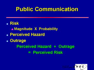 Understanding outrage is essential to communicate about risk. Risk in environmental health is formulated as magnitude (the size, severity, extent of area or population affected) x probability (how likely is the exposure or damage to occur). For example, an environmental risk assessment of a contaminated site calculate the dose that might be received through all routes of exposure, the toxicity of the chemical, the size and vulnerability (age, health) of the population potentially exposed (resident, future resident, transient) and the likelihood of exposure. This estimate of risk rarely correlates with the perceptions of the affected community and its individual members. That’s because community members are thinking of the risk in different terms. Peter Sandman developed through years of work in this area a different formula for risk. That is the one above: Perceived Risk = Perceived Hazard + Outrage. Dr. Peter Sandman, Rutgers faculty member, founded the Environmental Communication Research Program (ECRP) at Rutgers University, and created the “Hazard + Outrage” formula for risk communication. See web pages: qest.com.au/QestPeterSandman (for Peter Sandman) and aesop.rutgers.edu/cec (for Rutgers University, Center for Environmental Communication. |