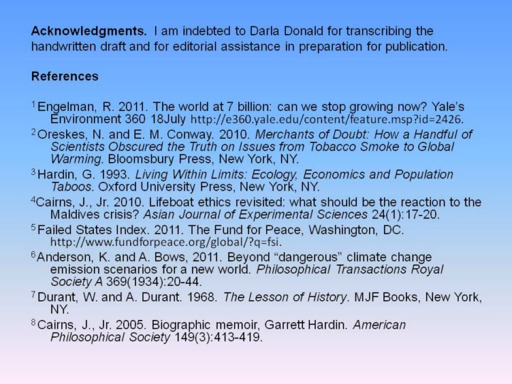8 Cairns, J., Jr. 2005. Biographic memoir, Garrett Hardin. American Philosophical