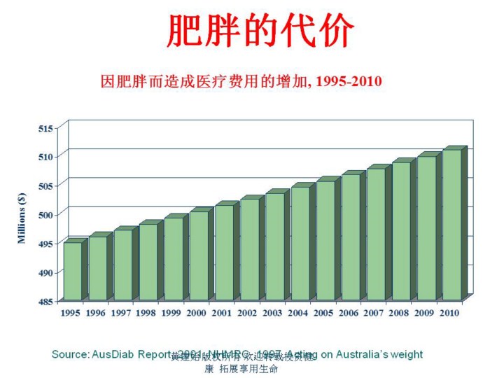 Uses the 1989 cost of obesity ($464 million) as a base line cost Assumes that the cost of obesity will rise 1:1 with the prevalence of obesity (ie if the prevalence of obesity rose 6.1% then the total cost of obesity has also risen 6.1% Obesity is assumed as BMI 30+ The cost of obesity is direct cost only (this means the costs associated with worker absenteeism and premature deaths are excluded) The cost of obesity should be viewed as very conservative because of a narrow range of diseases was included in the analysis (non-insulin-dependent diabetes, gallstones, coronary heart disease, hypertension, breast cancer and colon cancer): the potential cost associated with overweight (BMI 26 to 29.9) was not included; not all cost categories were estimated and the analysis did not include the costs of obesity treatment outside the formal healthcare system (Such as weight control centres and health clubs) The total cost is calculated by working out the average growth in prevalence and then multiplying that growth estimate ( a percentage) by the cost. The cost per year is only changing due to the prevalence rates. This will mean an underestimate as health system costs are increasing. The cost estimates assumes that obesity will grow at the same rate every year. This rate is the rate that prevalence grew from 1995-2000 and is a lot lower than the rate in previous years, therefore the actual rate could be much higher.