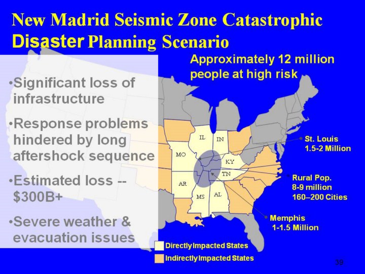 The New Madrid Seismic Zone is a huge fault in the Mid-West that runs roughly between St. Louis, Missouri and Memphis, Tennessee. The geology in the Central US makes earthquakes in that area much more intense and widespread. Sandy soil amplifies shock waves and creates an effect called liquefaction or the soil behaving as a liquid, producing tremendous damage to structures. This does not readily happen on the West Coast. Map shows comparison between 2 sets of comparable quakes (by magnitude). The significant quake in the area occurred in 1886. However, the most serious series of earthquakes in the area was in 1811-12 (4 major quakes within 3 months in winter 7.7, 7.0, 7.3, 8.0. on the Richter Scale of measurement for earthquakes). When this occurred, church bells rang across the U.S. including Massachusetts due to the ground vibration. the second weakest of these being the comparison in lower map. There appears to be a 200 year cycle of quakes in region some debate on this but a serious consideration (we are at 194 years since last significant series). There were a total of over 2,000 significant aftershocks during the events between 1811 and 1812. If you were to compare the situation on the West Coast, there are significant differences in impact due to variations of soil, topography, building structure, and population distribution. Quakes on the West Coast are more localized due to soil, etc. and population is concentrated, 24M people in southern California but all in close proximity challenge in NMSZ is the people are spread out across a wide 8-state region, and the fact that the quake resonates across a large region based upon soil differences. This will have a significant local, regional and national economic impact on: the retail community; warehousing/distribution; tourism dollars; transportation dependent roadside businesses; in summary a major disruption of commerce. Impact to national infrastructure compounds problem logistically getting supplies and relief to survivors will be exceptionally challenging. The Central United States Earthquake Consortium (CUSEC) has done some preliminary HAZUS modeling runs of potential impacts of an earthquake in the NMSZ, and the estimated total building loss in the area from one quake today would exceed $70 Billion. A comprehensive damage assessment for site specific catastrophic scenarios will be done during this project. Currently, only parts of this assessment exists. National Infrastructure Simulation and Analysis Center (NISAC) has estimated that a 10-day disruption in power infrastructure (fallen power lines) would cost $50B in economic impact 2/3 of which would be felt outside of this region. NMSZ has history of multiple large quakes in a series California does not (smaller aftershocks). This will require sending responders into a highly risky area and potentially losing responders to subsequent quakes. Recovery efforts could be dramatically affected as well. Extreme weather conditions could affect population movements when you consider the impact of Winter, Spring, Summer and Fall weather conditions. The Midwest does not have a uniform temperate climate like California or Florida. Significant impact on Critical Infrastructure and Key Resources |