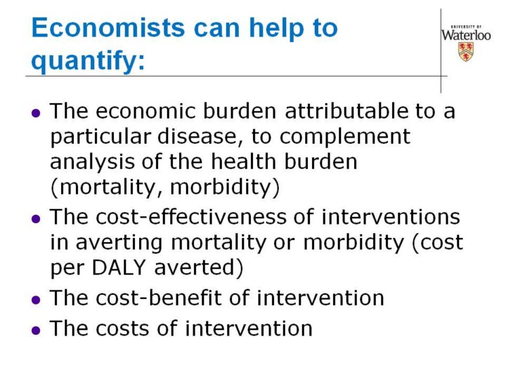 Selected resources: Lopez, A.D., C.D. Mathers, M. Ezzati, D.T. Jamison and C.J.L. Murray. Global Burden of Disease and Risk Factors. Oxford University Press and the World Bank, 2006. Musgrove, P. and J. Fox-Rushby. Cost-effectiveness analysis for priority setting. In D.T. Jamison et al Disease Control Priorities in Developing Countries. New York: Oxford University Press and World Bank, 2006. Available at: http://www.dcp2.org/pubs/DCP/15/ |