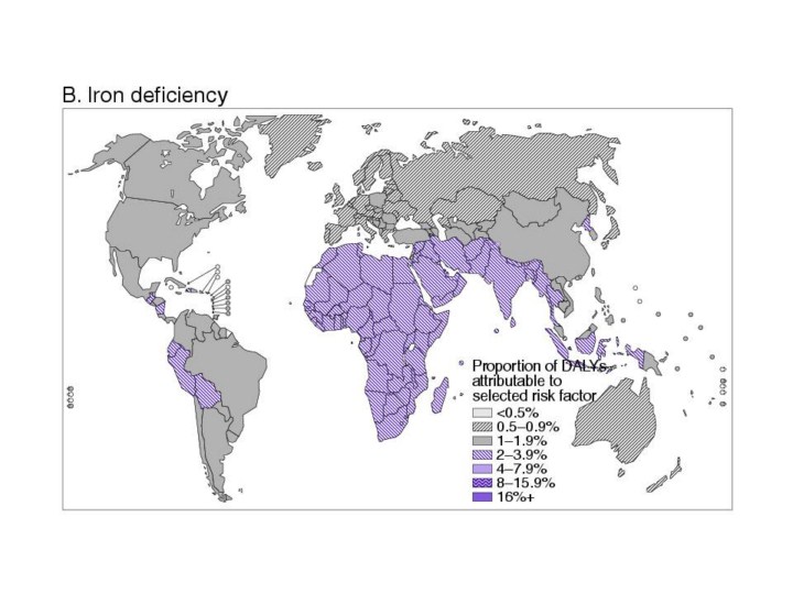 Why do you think iron deficiency is particularly concentrated in South Asia and sub-Saharan Africa? (Factors to consider: dietary iron intake – meat and animal products are a source of more bioavailable iron, but poor people do not consume these; iron is less well absorbed from diets heavy in grains containing phytates; iron is better absorbed with vitamin C – but fruit which is a rich source of vitamin C is expensive; hygiene is important – infection with hookworm is a cause of anemia, via blood loss; other factors?) |