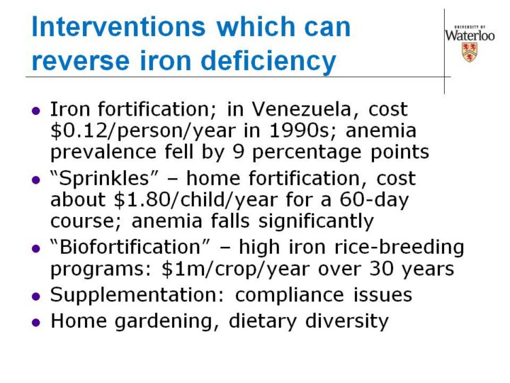 But it isn’t enough to know about the losses due to a nutritional deficiency – we have to have effective interventions to reduce the deficiency. For references and sources for these cost estimates see Horton et al Scaling Up Nutrition (full reference in notes to slide 4). And obviously, these interventions do not completely eliminate anemia – we have to know what proportion of current anemia can be removed by each intervention. |