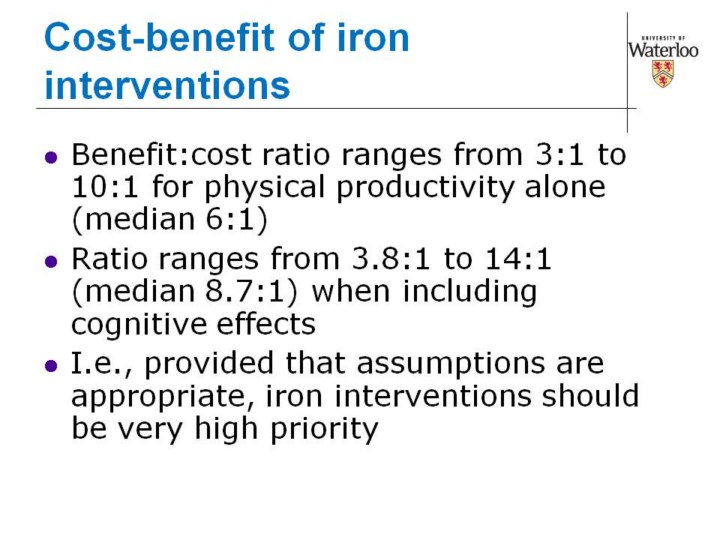 Here we calculate the benefit:cost ratio, comparing the cost of fortification, with the value of benefits which could be obtained by reducing (but not eliminating) anemia |