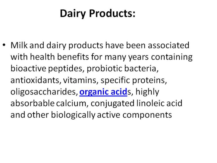 Consumer's increasing interest for maintaining or improving their health by eating these specific food products has led to the development of many new functional dairy products. These dairy products contain many functional ingredients that decrease the absorption of cholesterol, can significantly reduce blood pressure, play role in the regulation of satiety, food intake and obesity-related metabolic disorders and may exert antimicrobial effects.
