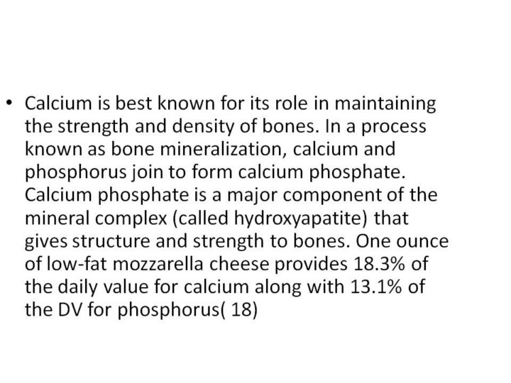Calcium also plays a role in many other vital physiological activities, including blood clotting, nerve conduction, muscle contraction, regulation of enzyme activity, cell membrane function and blood pressure regulation. Because these activities are essential to life, the body utilizes complex regulatory systems to tightly control the amount of calcium in the blood, so that sufficient calcium is always available. As a result, when dietary intake of calcium is too low to maintain adequate blood levels of calcium, calcium stores are drawn out of the bones to maintain normal blood concentrations. If a person's diet does not supply adequate calcium, this situation can result in osteoporosis after many years. For young girls going through the rapid growth spurts of puberty, getting calcium from dairy products, such as cheese, may be better for building bone than taking a calcium supplement, suggests a study published in the American Journal of Clinical Nutrition.(19) At the conclusion of the study, girls getting their calcium from cheese had higher whole-body bone mineral density and cortical thickness of the tibia than girls given supplemental calcium + vitamin D, supplemental calcium alone, or placebo. While the researchers noted that differences in the rate at which different children naturally grow might account for some of the differences seen in bone mineral density, they concluded: "Increasing calcium intake by consuming cheese appears to be more beneficial for cortical bone mass accrual than the consumption of tablets containing a similar amount of calcium."( Cheng S, Lyytikainen A, Kroger H, Lamberg-Allardt C, Alen M, Koistinen A, Wang QJ, Suuriniemi M, Suominen H, Mahonen A, Nicholson PH, Ivaska KK, Korpela R, Ohlsson C, Vaananen KH, Tylavsky F. Effects of calcium, dairy product, and vitamin D supplementation on bone mass accrual and body composition in 10-12-y-old girls: a 2-y randomized trial. Am J Clin Nutr. 2005 Nov;82(5):1115-26. 2005. PMID:16280447. (19 )