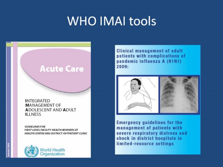 IMAI = Integrated Management of Adolescent and Adult Illness HIV care and H1N1 preparedness Sepsis management getting “via the back door” – good for training but not for raising general awareness and getting the idea about sepsis into public / policy spheres... |