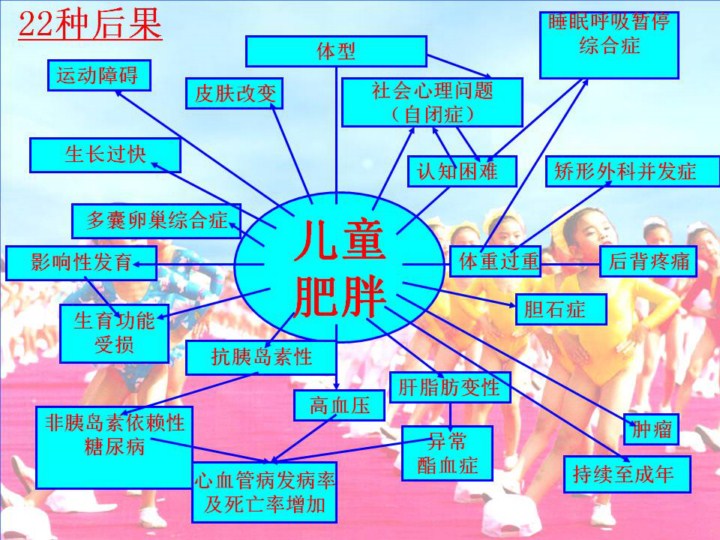 绿色的为高患病率并发症; 其中许多症状又互相影响,如运动障碍导致肥胖和心血管病危险性增加,并未全部列出 儿童肥胖另外一个重要危险:不仅肥胖体型,其他所有症状都有可能延续至成年人,并且肥胖儿童即使成年后恢复正常体重,其心血管疾病患病率和早死率仍然高。
