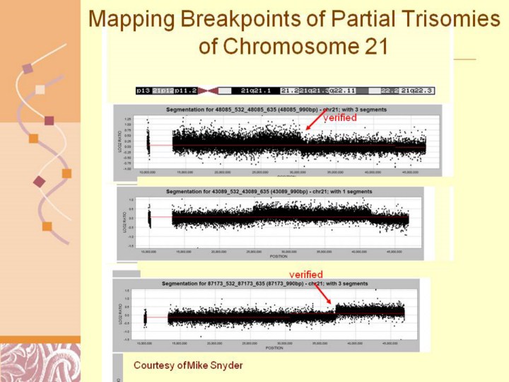 In this project we use an HR-CGH array covering the sequence of Cs21 To map the breakpoints in a panel of patients with partial trisomy 21 and down syndrome spectrum phenotypes These are the first 3 hybridizations from that panel a As you can see the aberrations can occur in various forms and for two we could already confirm the breakpoint predictions by PCR and sequencing |