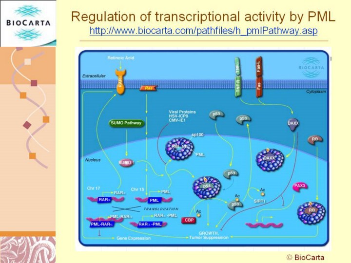 http://www.biocarta.com/pathfiles/h_pmlPathway.asp The PML nuclear bodies are ring-shaped nuclear substructures associated with the regulation of transcription, transformation, cell growth, and apoptosis and are characterized by the presence of the protein PML. The activities of PML as a tumor suppressor and apoptosis inducing factor are exerted through the numerous proteins it interacts with in the PML-nuclear bodies including the tumor suppressor p53. DNA damage induced activation of p53-dependent apoptosis requires PML. PML acts as a coactivator for p53 and increases acetylation of p53 by the transcriptional coactivator CBP. This acetylation of p53 is reversed by the deacetylase SirT1, the human homolog of the yeast gene Sir2, and this deacetylation opposes the transcriptional activation of p53. The tumor suppressor Rb also interacts with the PML nuclear body, increasing transcriptional repression of genes involved in cell cycle progression, suggesting that PML may affect cellular transformation through more than one mechanism. PML interacts directly with Ubc9, which modifies PML through the attachment of the ubiquitin-like peptide Sumo-1 (see SUMO pathway). Sumo-1 modification of PML is not necessary for the nuclear bodies to form, but may affect the recruitment of proteins that interact with PML. PML is involved in non-p53 mediated apoptotic pathways, such as DAXX-mediated apoptosis induced by Fas and TNF and regulates the transcriptional repressor activity of Daxx. The sequestration of Daxx by the PML nuclear bodies relieves the repression of other transcription factors like Pax3 by Daxx. Tumor suppression by PML may in general involve the formation of specific regulatory transcription complexes, including those with DAXX, p53 and CBP.