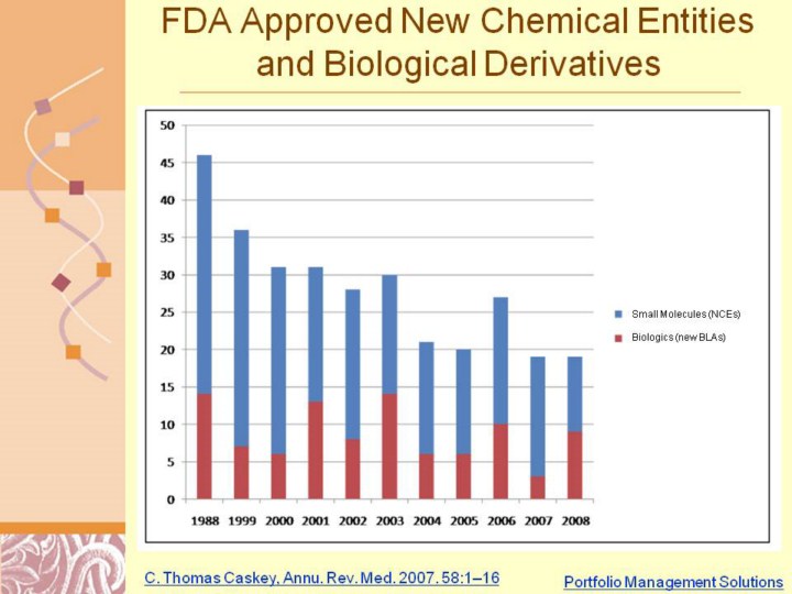 Table 1, Numbers of New Small Molecule Drug Approvals per Year (NMEs) Compared to New Biologic Drug Approvals (new BLAs) 1988-2008. (Ref. 3)  Biologics here are not restricted to monoclonal antibodies, cytokines, tissue growth factors and therapeutic proteins.  Last line* shows therapeutic proteins and Mabs from Ref 4, 5.