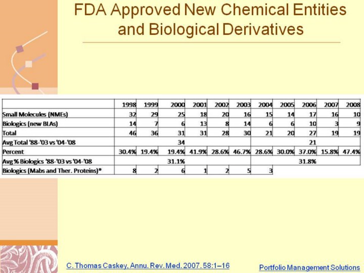 Table 1, Numbers of New Small Molecule Drug Approvals per Year (NMEs) Compared to New Biologic Drug Approvals (new BLAs) 1988-2008. (Ref. 3) Biologics here are not restricted to monoclonal antibodies, cytokines, tissue growth factors and therapeutic proteins. Last line* shows therapeutic proteins and Mabs from Ref 4, 5. |