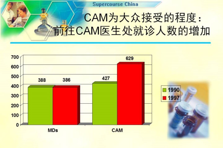 Now, these are enormously popularly practices, and while the specific data here might be questioned, the survey by David Eisenberg at Harvard published four years ago suggested that people in the United States are making more visits to CAM practitioners, and that those numbers -- that number of visits grew more rapidly in the decade of the 1990s than to mainstream, conventional, M.D. practitioners. This is big business. CAM为大众接受的程度:前去CAM医生就诊的增长: