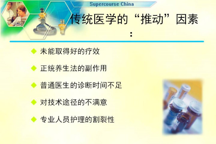 You have to wonder what it is that drives people to choose these therapies when scientific medicine has wrought such extraordinary achievements in prolonging life and improving the quality of life over the past century and a half. And in part, it has to do with things that some of us find unnerving or discomforting about conventional medicine, things that push some of us away. The fact that we can’t cure all of the patients we would like to cure; that many of our therapies have adverse effects -- they’re not risk free. We practitioners are bound to shorter and shorter increments of time we’re allotted to visit with our patients. Managed care dictates that we crank patients through. Our health care process is highly technical rather than personal, and our care is fragmented among many specialists. 传统医学的推动因素: 未能取得很好的治疗效果 正统养生法的副作用 缺乏就诊时间 对技术途径的不满意 专家护理的割裂性