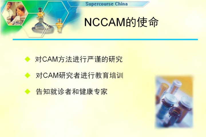 NCCAM的使命: 对CAM方法进行严谨的研究 对CAM研究者进行教育培训 告知消费者和卫生健康专家 告知就诊者和健康专家