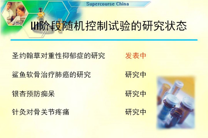 第三阶段随机控制试验的研究状态: St. John’s Wort对重性抑郁症的研究 发表中 鲨鱼软骨治疗肺癌的研究 研究中 银杏预防痴呆 研究中 针灸对骨关节疼痛的治疗作用 研究中