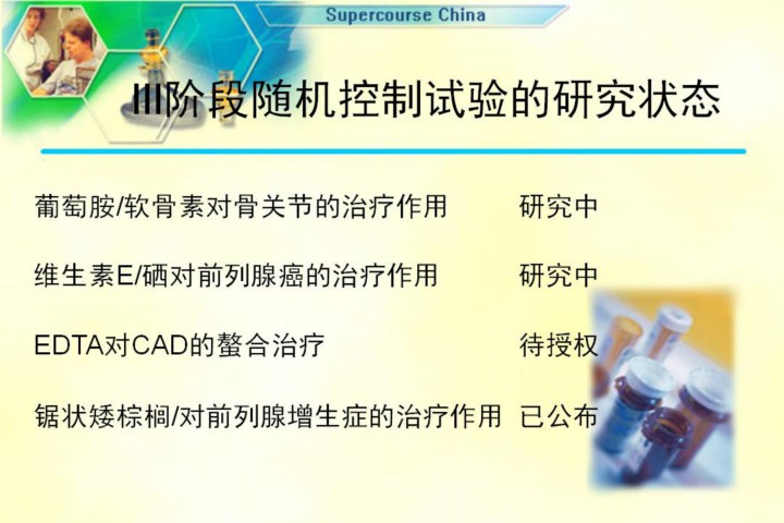 第三阶段随机控制试验的研究状态: 葡萄胺/软骨素对骨关节的治疗作用 研究中 维生素E/硒对前列腺癌的治疗作用 研究中 EDTA对CAD的螯合治疗 授予未决 锯状矮棕榈/对前列腺增生症的治疗作用 已公布