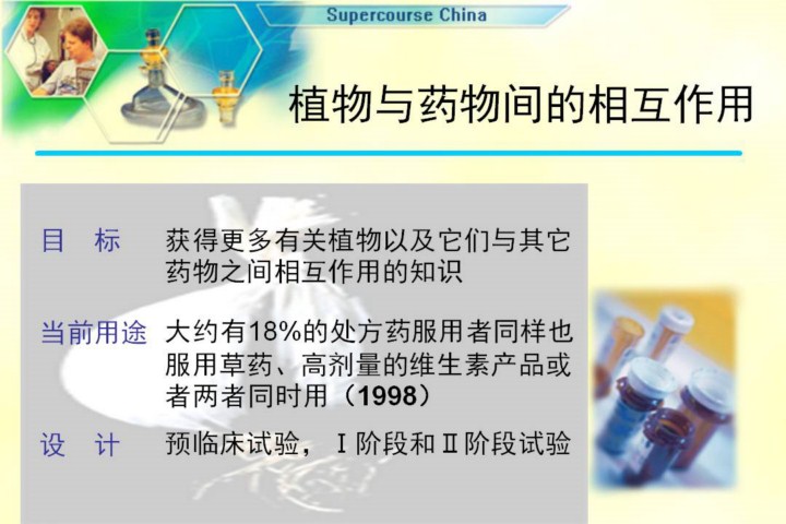 植物/药物的相互作用 目标 获得更多有关植物以及它们与其它药物之间相互作用的知识 目前用途 大约有18%的处方药服用者同样也服用草药、高剂量的维生素产品或者两者同时用(1998) 设计 预临床试验、第Ⅰ、Ⅱ阶段 |