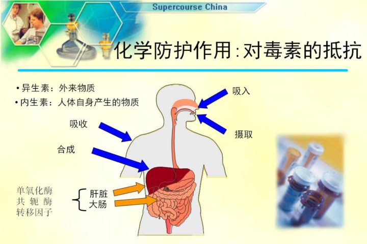 化学保护作用: 抵抗毒素 吸入 摄取 吸收 合成 肝脏 胰脏 --------单氧化酶、共轭酶和转移因子