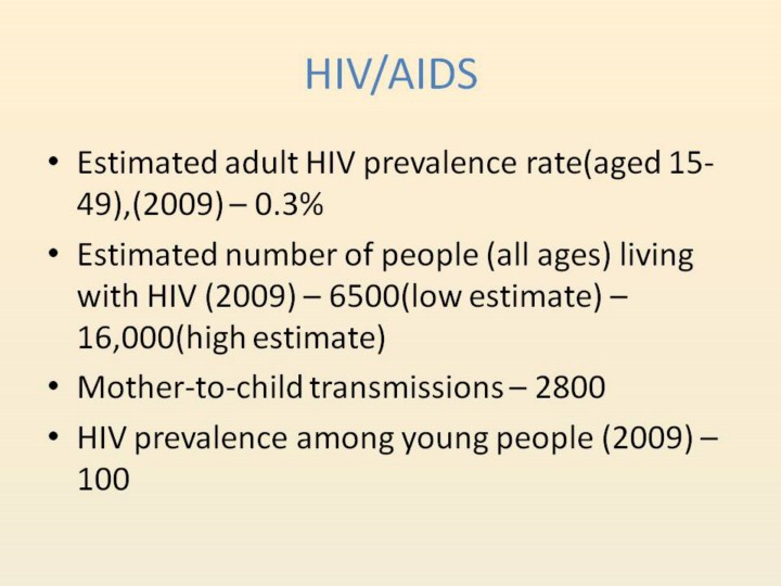HIV/AIDS - adult prevalence rate 0.3% (2009 est.) HIV/AIDS - people living with HIV/AIDS 9,800 (2009 est.) HIV/AIDS - deaths fewer than 500 (2009 est.) HIV/AIDS - adult prevalence rate 0.3% (2009 est.) HIV/AIDS - people living with HIV/AIDS 9,800 (2009 est.) HIV/AIDS - deaths fewer than 500 (2009 est.) http://www.indexmundi.com/kyrgyzstan/demographics_profile.html |