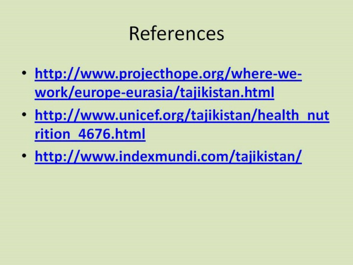http://www.projecthope.org/where-we-work/europe-eurasia/tajikistan.html http://www.unicef.org/tajikistan/health_nutrition_4676.html http://www.indexmundi.com/tajikistan/ https://www.cia.gov/library/publications/the-world-factbook/geos/ti.html |