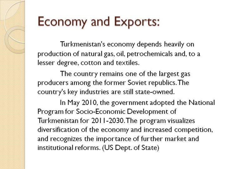 http://en.wikipedia.org/wiki/Turkmenistan Turkmenistan's GDP growth rate of 11% in 2010 ranks 4th in the world, but these figures are subject to wide margins of error.[5] It possesses the world's fourth largest reserves of natural gas resources. Although it is wealthy in natural resources in certain areas, most of the country is covered by the Karakum (Black Sand) Desert. |